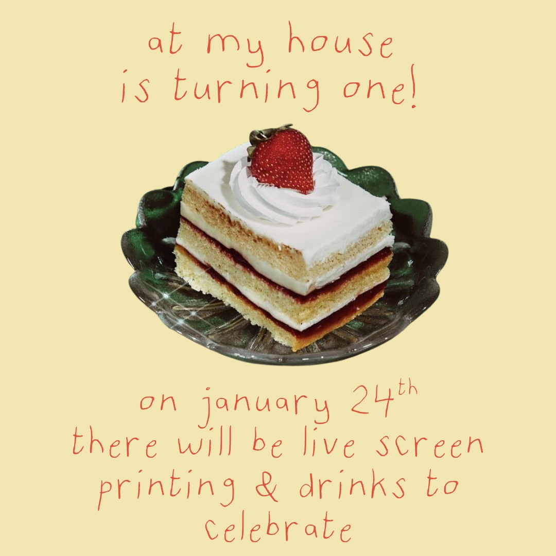 One year of At My House! One year of vintage, events, late nights, ideas that worked, ideas that didn't, and a lot of people coming through the door. We're celebrating with drinks, snacks, and live screen printing of our first merch. Come by, say hi, hang out, and help us kick off year two!