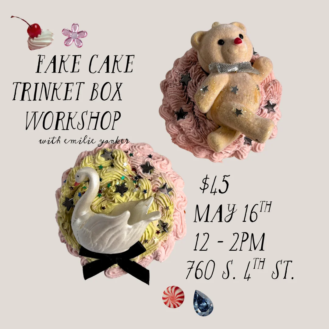 Join us for a hands-on workshop with artist Emilie Yonker, where you'll make your own fake cake trinket box—fully frosted, decorated, and as over the top as you want! We'll provide all materials, plus a selection of trinkets to choose from. You're also welcome to bring your own small objects to personalize your piece. No experience needed—just come ready to decorate something that looks good enough to eat (but don't). Please note: Tickets are non-refundable, so make sure you can make it before grabbing yours! We may take photos during the event for documentation and promo — just let us know if you'd prefer not to be photographed.
