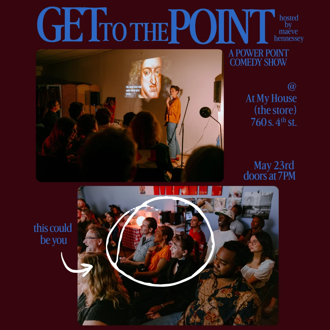 Get to the Point is a PowerPoint comedy show hosted by Maeve Hennessey, where comedians take the stage armed with slides, ideas, and no shame. In past presentations we've learned the history of the hot air balloon, fertility and the Twilight universe, and a Sex and the City crash course comparison to Maslow's Hierarchy of Needs. Come find out what we'll be educated on this time.