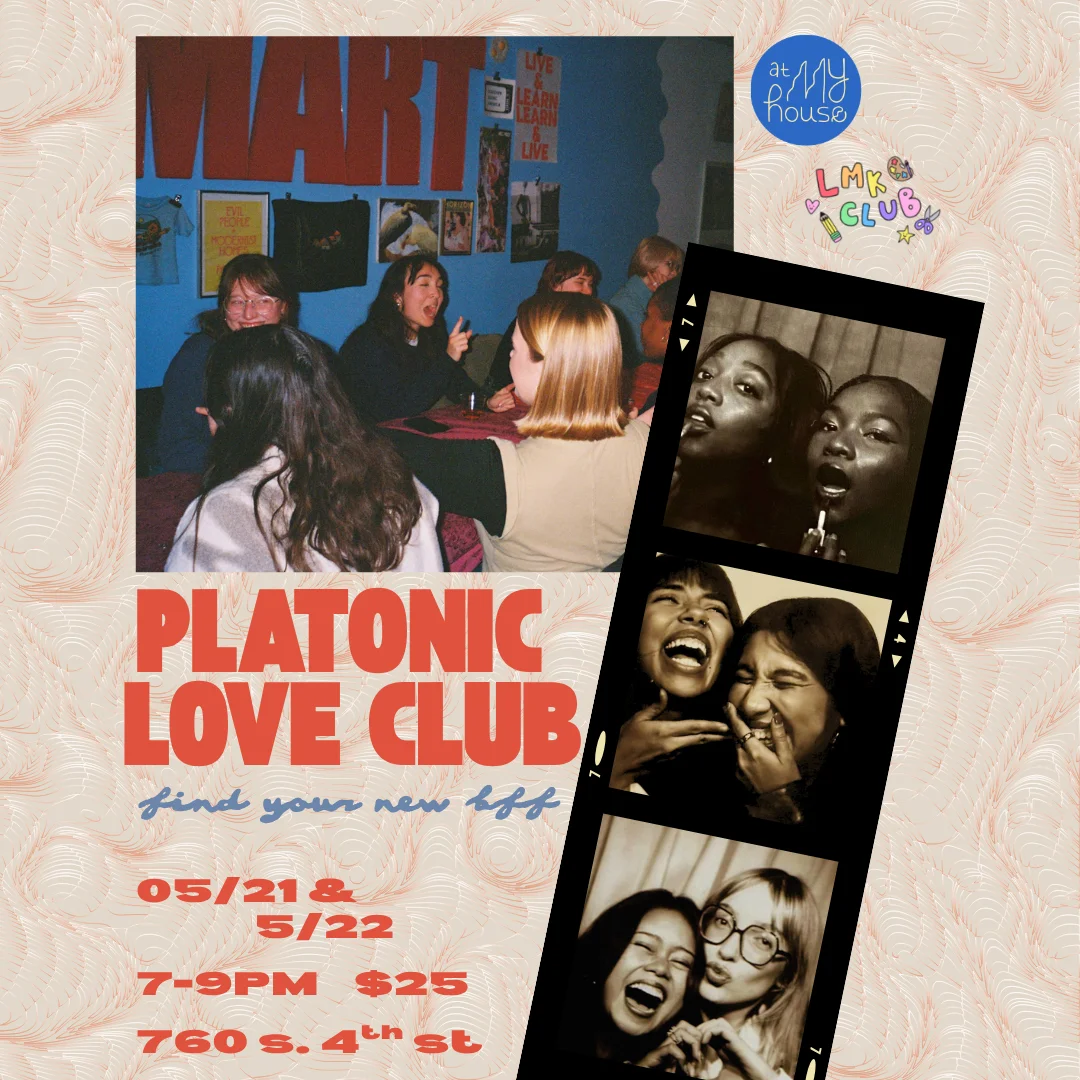 The Let Me Know Club is back with one of our favorite collabs: Platonic Love Club! It's speed dating, but strictly for finding friends. You'll get five minutes to chat, laugh, and see if there's a friendship spark before moving on to the next new pal. We'll have icebreaker prompts to keep things flowing and post-event hangout ideas to keep the night going.